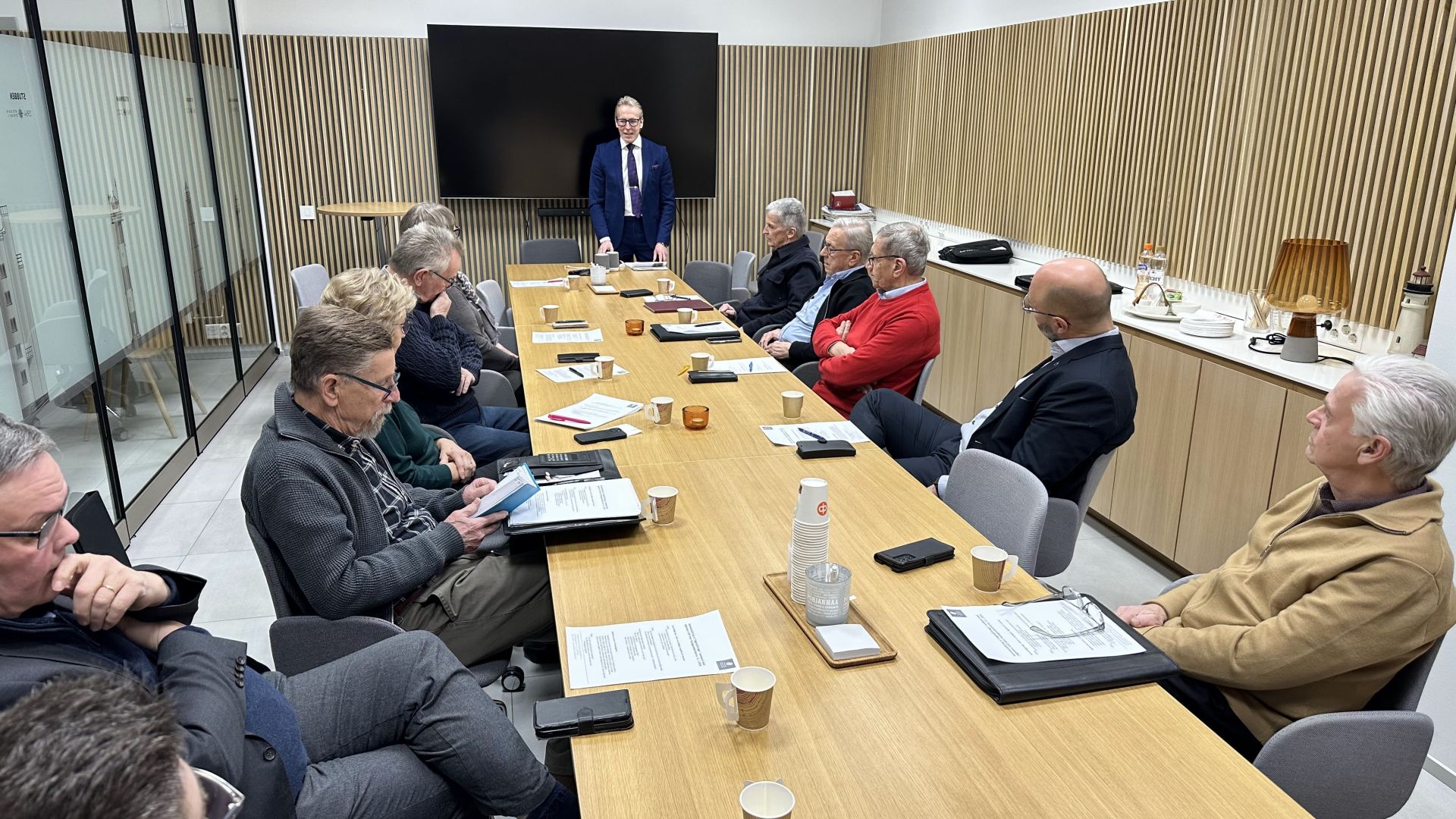 Vasa Andelsbanks avgående vd Ulf Nylund välkomnade regionstyrelsen och riksdagsledamöterna välkomna till banken för sista gången före hans pensionering. (foto: Patrick Ragnäs)